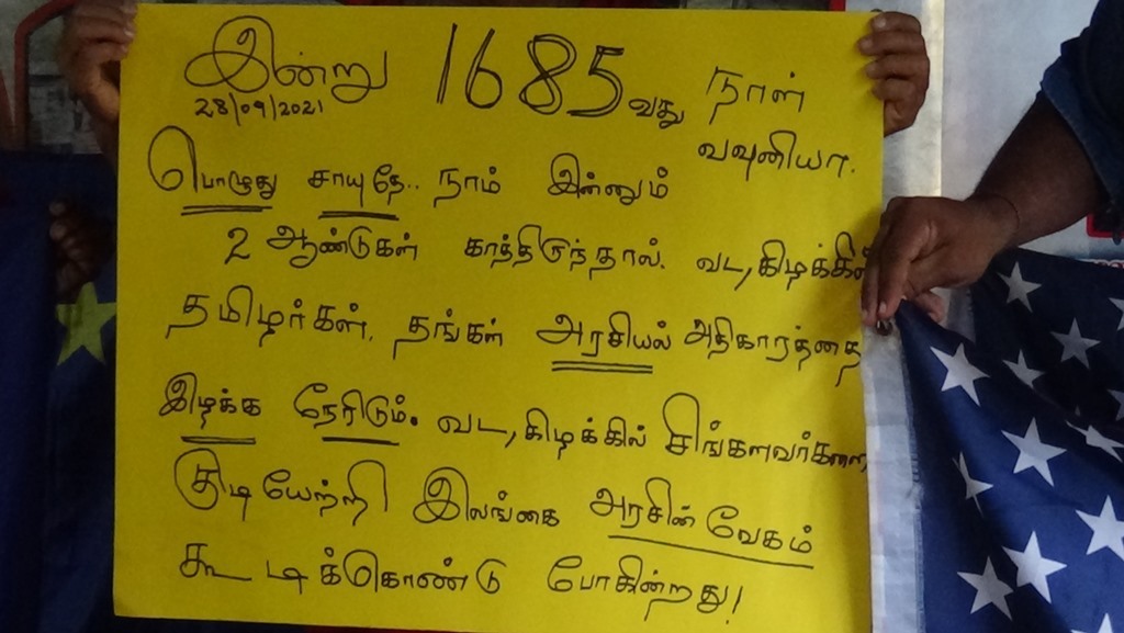 சிங்கள இராணுவம், காவல்துறை மற்றும் சிங்கள அரசியல்வாதிகளிடமிருந்து ஆக்கிரமிப்பு மற்றும் ஒடுக்குமுறையிலிருந்து தமிழர்களைப் பாதுகாக்க ஒரு அரசியல் தீர்வு தேவை. பொழுது சாயுதே, நாம் இன்னும் 2 ஆண்டுகள் காத்திருந்தால், வடக்கு மற்றும் கிழக்கில் தமிழர்கள் தங்கள் அரசியல் அதிகாரத்தை இழக்க நேரிடும்.