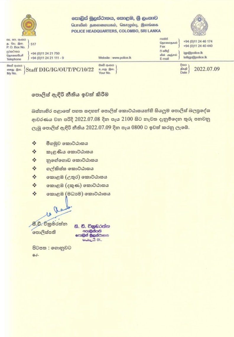 நீர்கொழும்பு, களனி, நுகேகொடை, கல்கிசை, கொழும்பு வடக்கு, கொழும்பு மத்திய மற்றும் கொழும்பு தெற்கு ஆகிய பொலிஸ் பிரிவுகளுக்கு நேற்றைய தினம் ஊரடங்கு உத்தரவு பிறப்பிக்கப்பட்டிருந்தமை குறிப்பிடத்தக்கது.