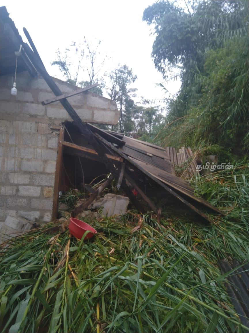மண்மேடு சரிந்து வீழ்ந்ததில் வீட்டின் ஒரு பகுதி முழுமையாக சேதமடைந்துள்ளது.