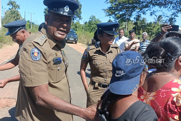 எனினும் மக்கள் கிராம சேவையாளர் அவ்விடத்திற்கு சமூகளிக்கும் வரை தாம் செல்ல மாட்டோம் என தெரிவித்த நிலையில் குறித்த பொலிஸ் நிலைய பொறுப்பதிகாரி மக்களை பலவந்தமாக தள்ளி வெளியேற்ற முயன்றதுடன், கதிரையில் அமர்ந்திருந்த மாற்றுத்திறனாளியான முதியவரை தள்ளி, அவர் அமந்திருந்த கதிரையினை தூக்கி பற்றைக்குள் வீசியுள்ளார்.